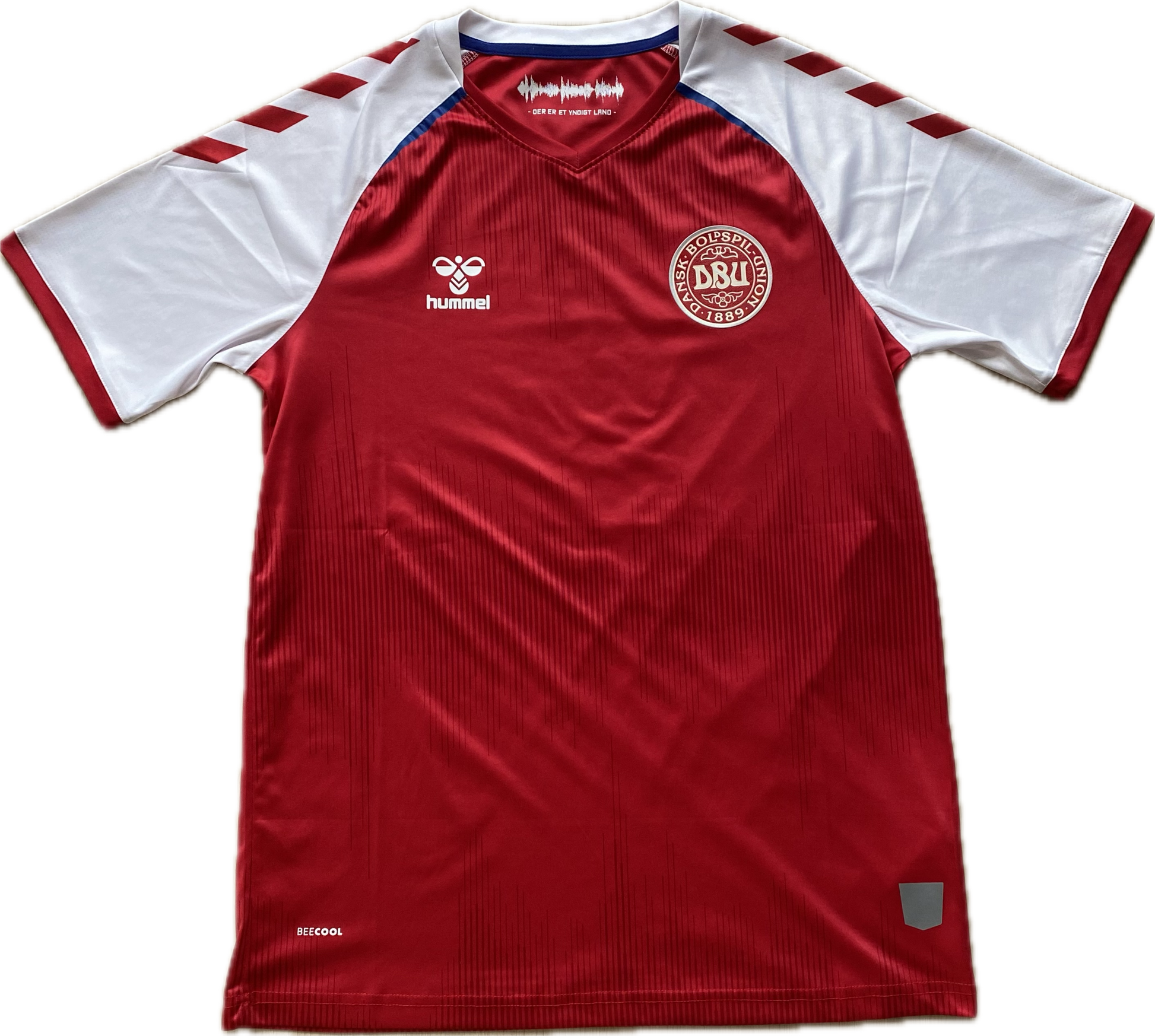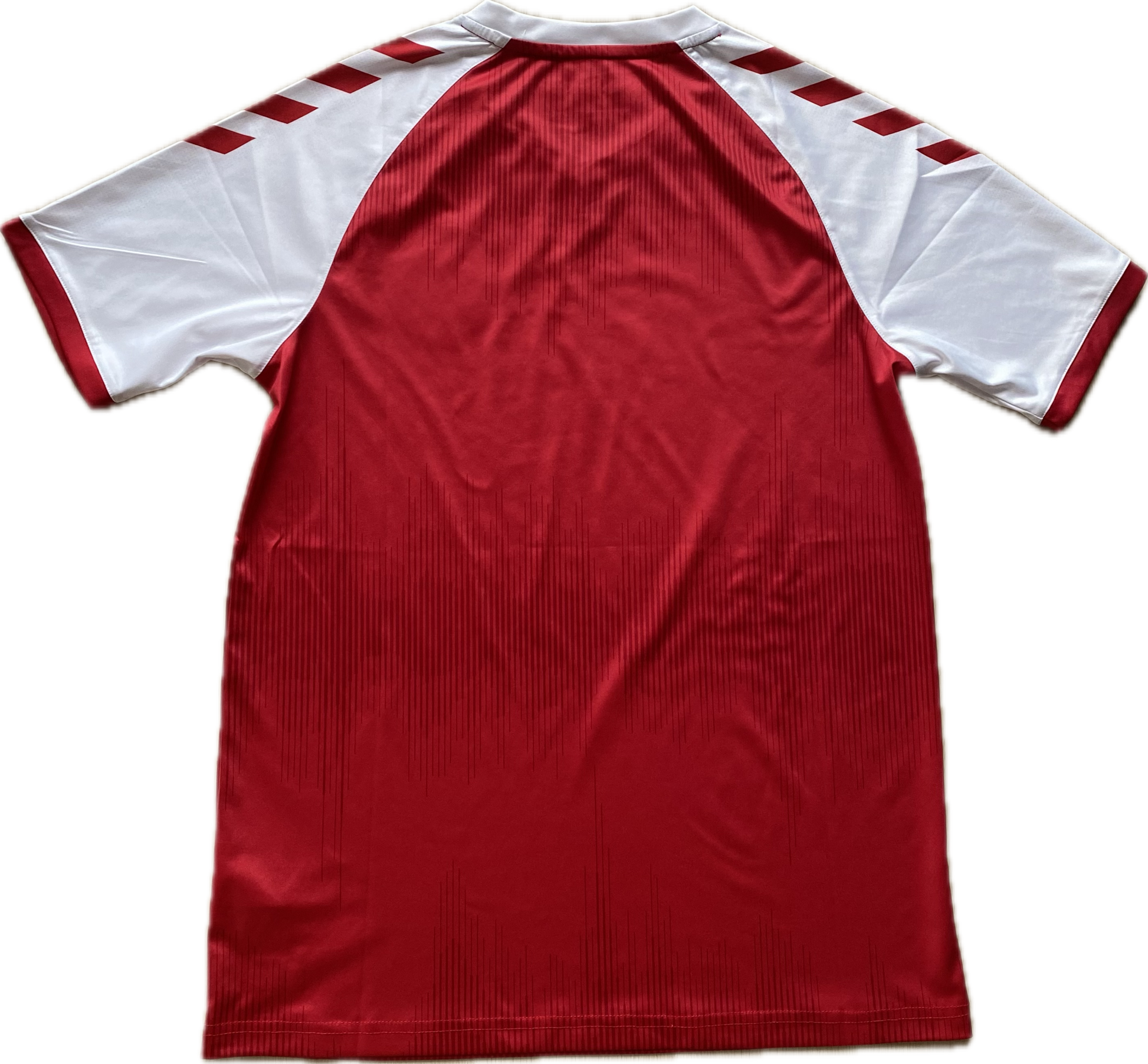 Histoire : Maillot domicile porté par les Rød-Hvide lors de l'Euro 2020 où ils termineront deuxièmes du groupe B derrière la Belgique et qualifiés pour la phase à élimination directe. Ils élimineront ensuite successivement le Pays de Galles en huitièmes de finale puis la République Tchèque en quarts avant de chuter face au Three Lions après prolongations en demie finale.. Cette tunique servira également pour la campagne de qualification à la Coupe du Monde 2022 et lors de la Ligue des Nations 2022.