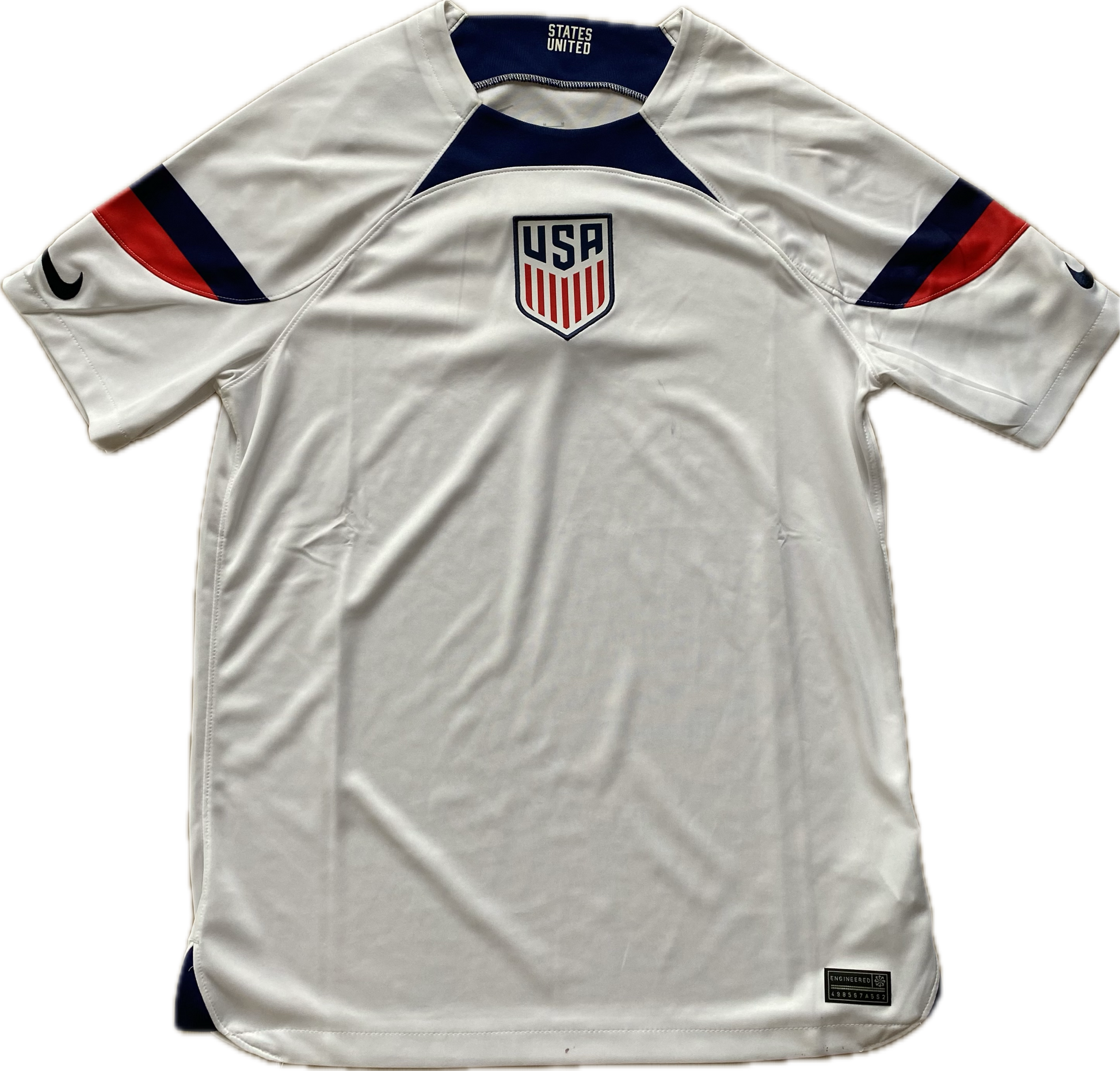 Histoire : Maillot domicile porté par les Stars and Stripes lors de la Coupe du Monde 2022 au Qatar où ils termineront deuxièmes de leur groupe derrière l'Angleterre, avant de chuter en huitièmes de finale face aux Pays-Bas. Cette tunique sera également utilisée lors de la Gold Cup perdue en finale contre le Panama ainsi que lors de la Ligue des Nations remportée face au Mexique.
